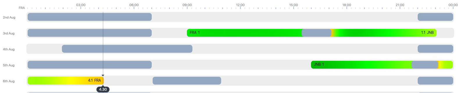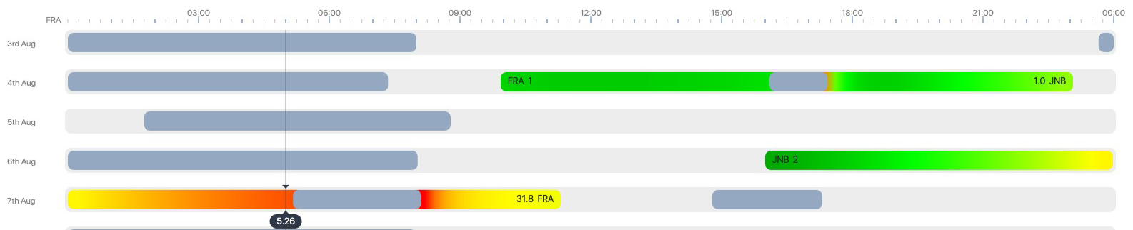 We have undertaken a comparative analysis of the usual LH573 route and duty times and the impact of the closed airspace on the diversion to Lagos using the SAFE model. In both cases, the outbound flight has been included in the analysis to account for cumulative fatigue.