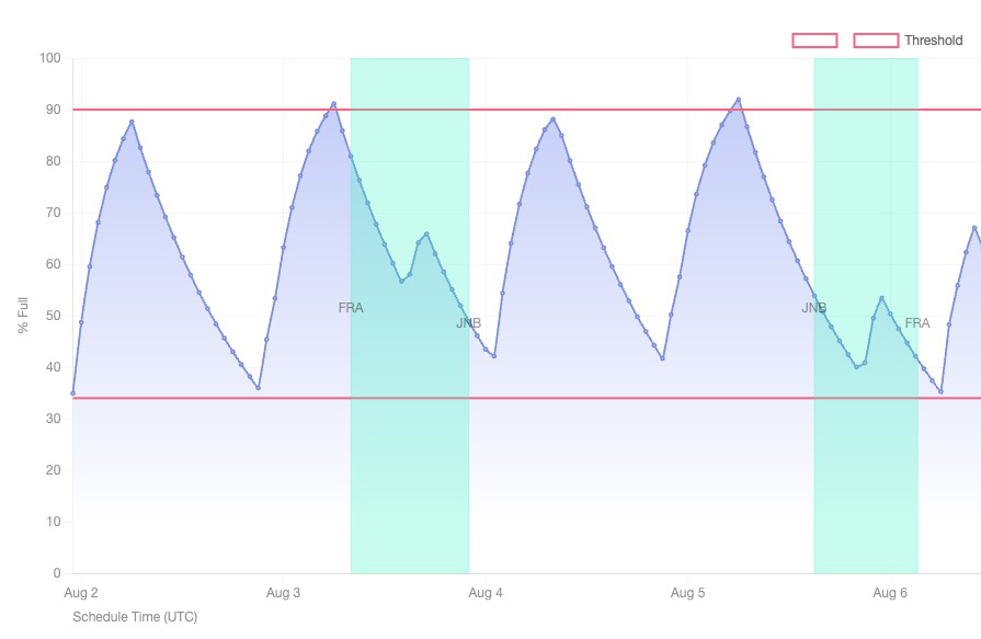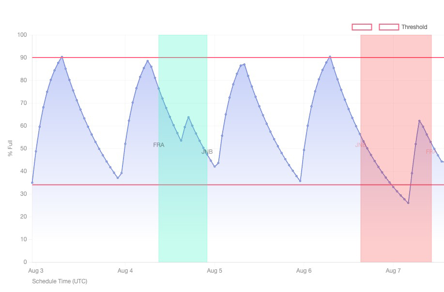 The capabilities of SAFE (and its sister model CARE, for Cabin Crew) enable these “what if” scenarios to be modelled easily and in real time so that sudden changes such as those caused by the closure of air space can be understood. Mitigation actions such as adding extra crew members or providing rest facilities on board can be easily evaluated as well as whether the sleep reservoirs (Process S) of the crew are sufficient to complete the journey. In the figure below, it can be seen that the sleep reservoir in the rerouted LH573 flight has dropped significantly below the threshold that will mean high levels of sleep pressure for the pilots.